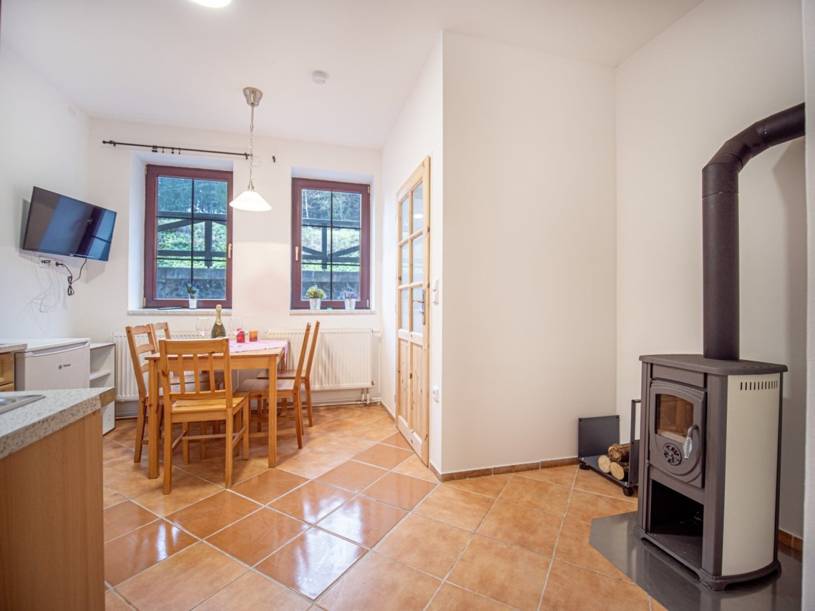 - kompletně vybavená obytná kuchyně s varnou deskou, mikrovlnnou troubou, myčkou, ledničkou, TV